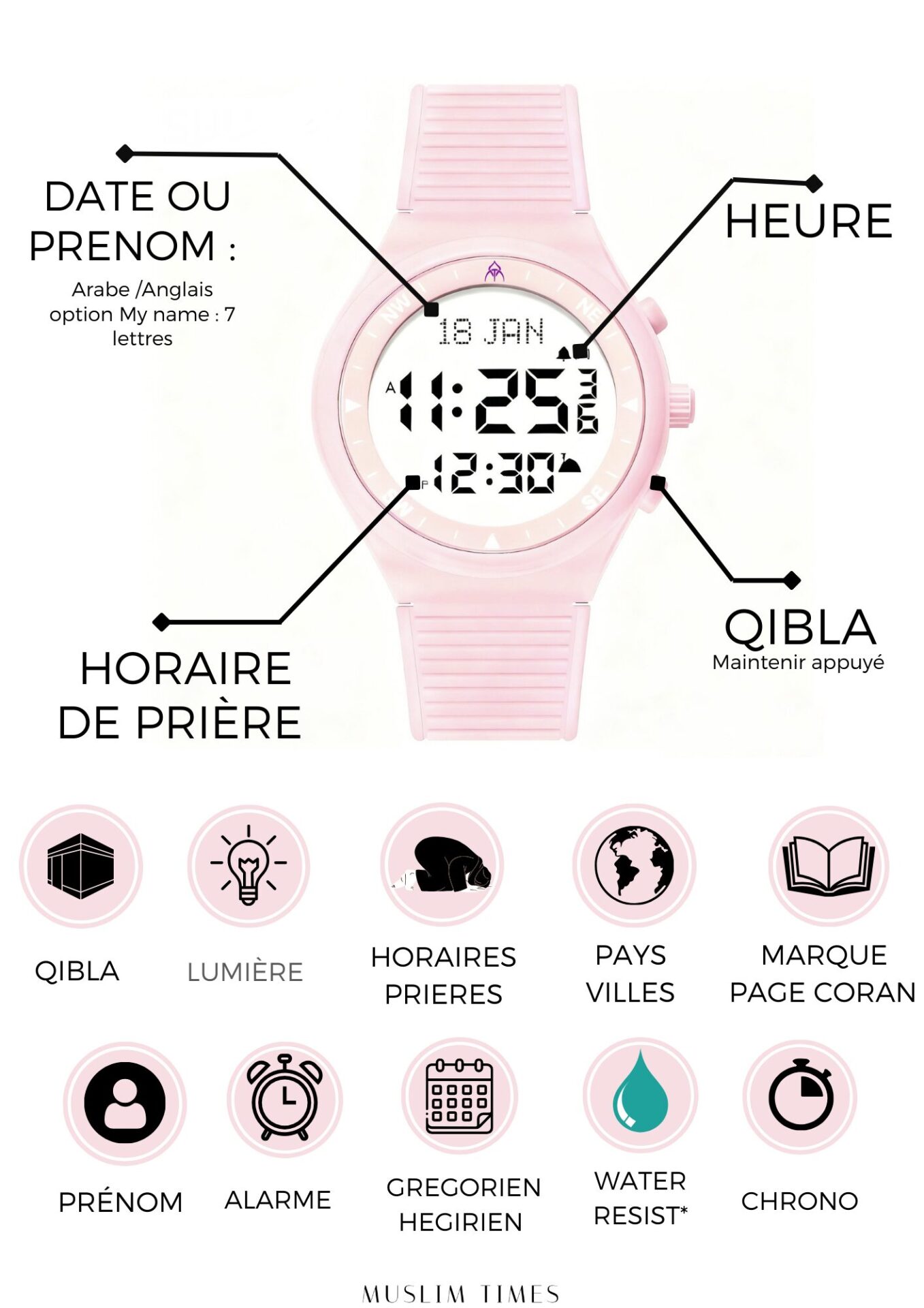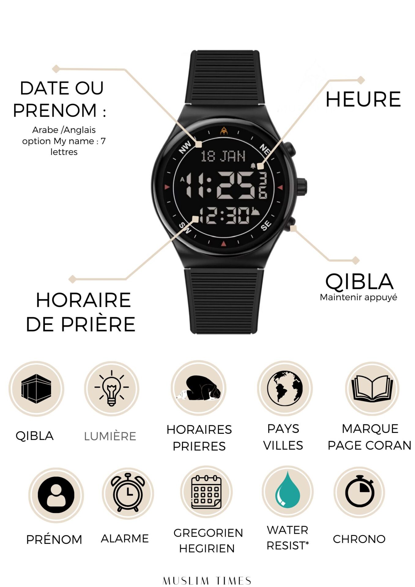 - Organisation simplifiée : l’heures des prières simplement à votre poignet.
